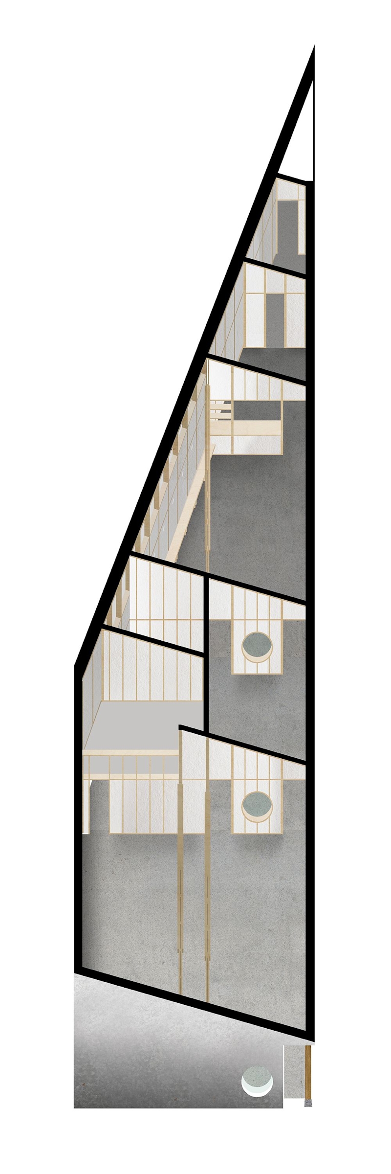 An enfilade of circular windows frames a view down the length of the building, whilst the rear wall rises above the boundary fence to bring in light from high-level.
