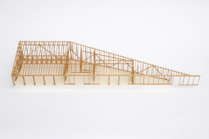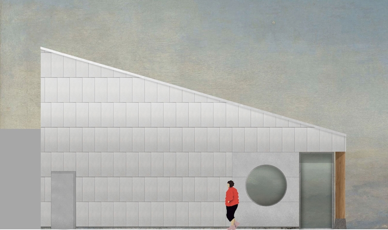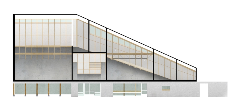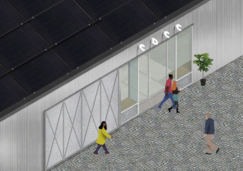 The building’s unusual footprint is created by the constraints of the site, with the main events space occupying the largest end. This open and column free space is made possible by a 12m long timber mega-truss, which supports the lateral roof span. Throughout the building, an exposed timber frame will be filled with in-situ hempcrete that simultaneously forms the internal finish, thermal mass and insulation. This handmade and almost rustic interior is contrasted with the sharp modularity of a panelised metallic exterior.