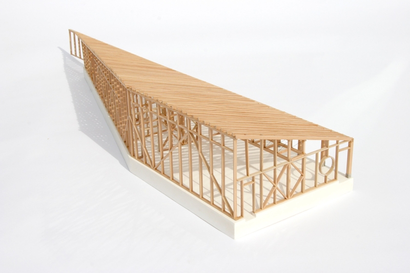 The structural frame is designed with a single type of timber section. Long 12m roof spans are supported mid-way by a mega-truss which doubles up as a gantry.
