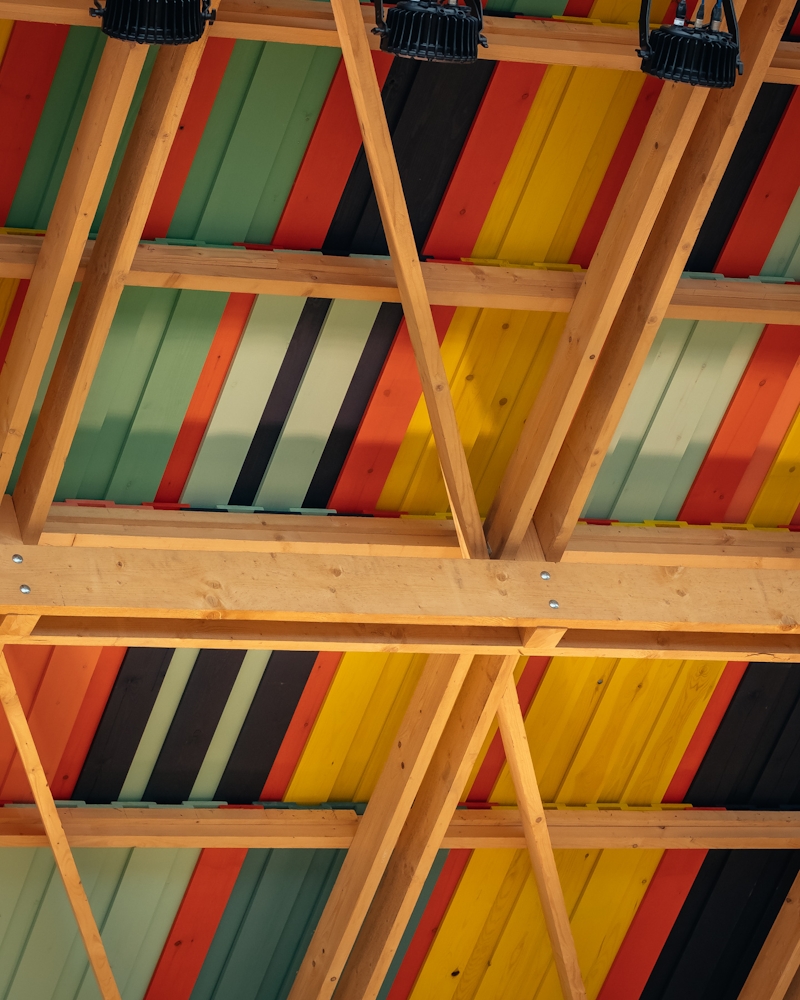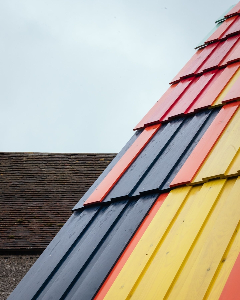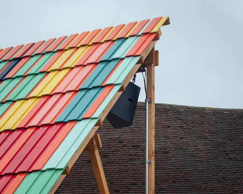 The design is inspired by the big roofs of the surrounding barns, which are a strong part of the Sussex vernacular. The structure is imagined as half of a barn roof opening up to the audience, whilst the colours of the roof are inspired by the painted interiors of Charleston house itself. Like the house, the stage reflects a sense of exuberance and vibrancy, intended to welcome people back from the winter's lock-down.