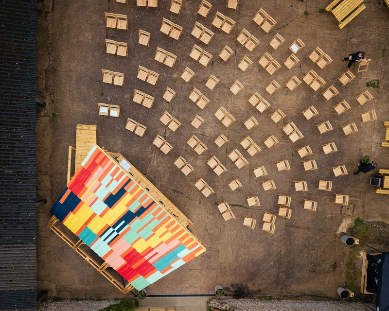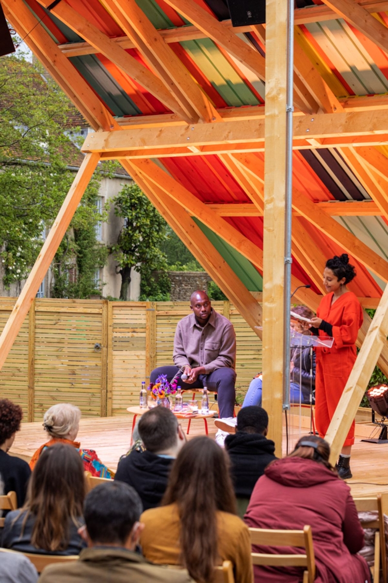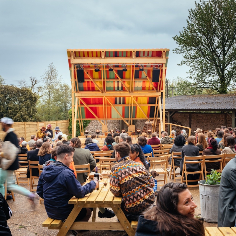 Pup Architects designed and built a temporary outdoor stage for Charleston, the colourful former home of the Bloomsbury group and now museum, to host a summer season of events and talks.