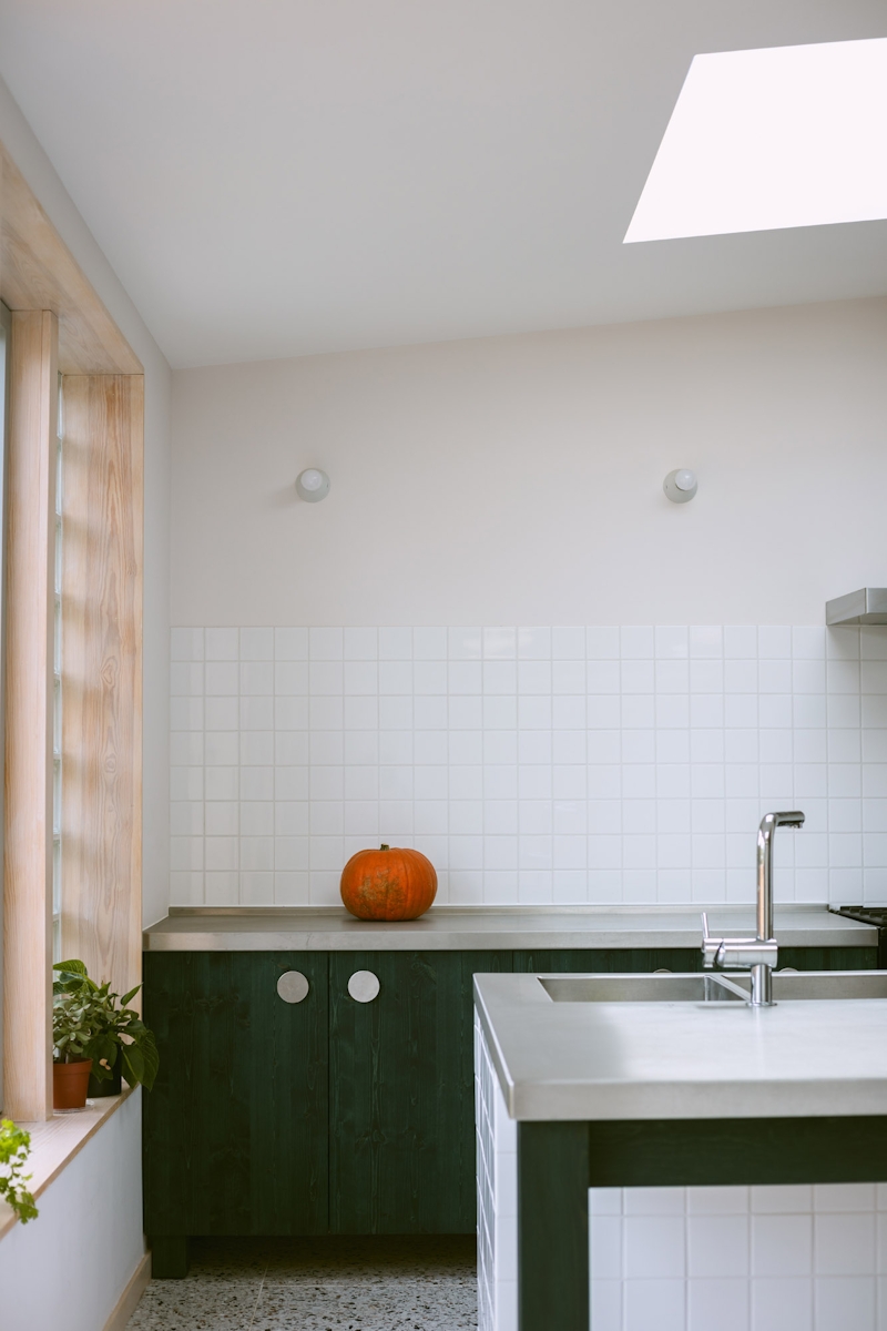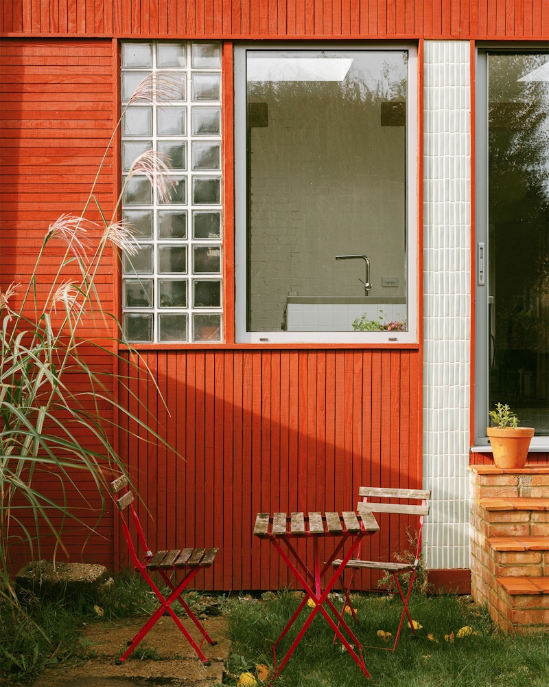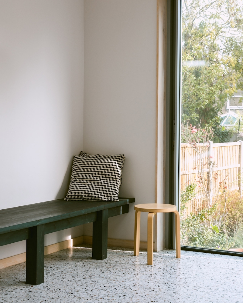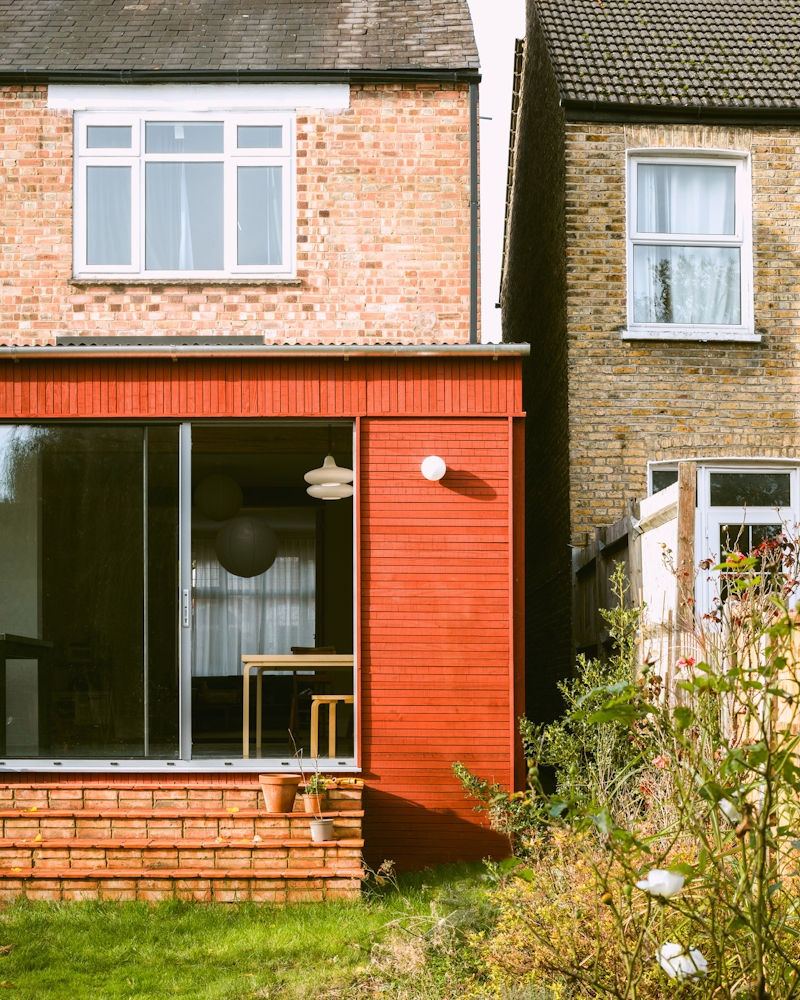 This extension to an Edwardian semi-detached house is conceived as a building with its own character, forming a new frontage to the spacious garden. The British Larch cladding is boldly painted with mineral pigment, which is a nod to the client’s time spent living in Nordic countries.